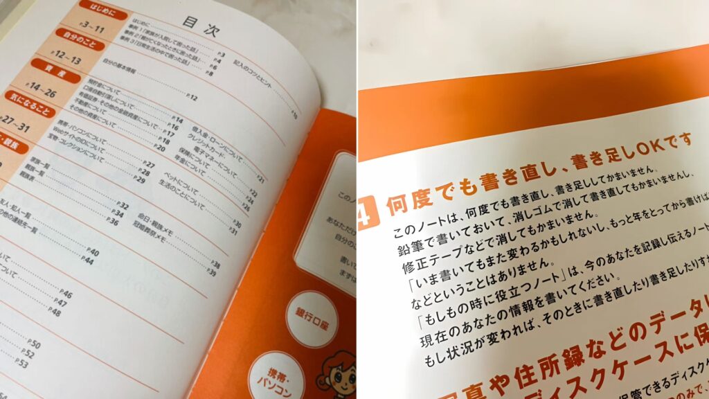 私は、できるだけ暗い気持ちにならずに楽しんで書けるように、オレンジ色のコクヨのエンディングノートを買いました。文字も大きめで見やすく、知っておきたい情報もイラストでわかりやすく載っていたので、迷ったらこちらをおすすめします。